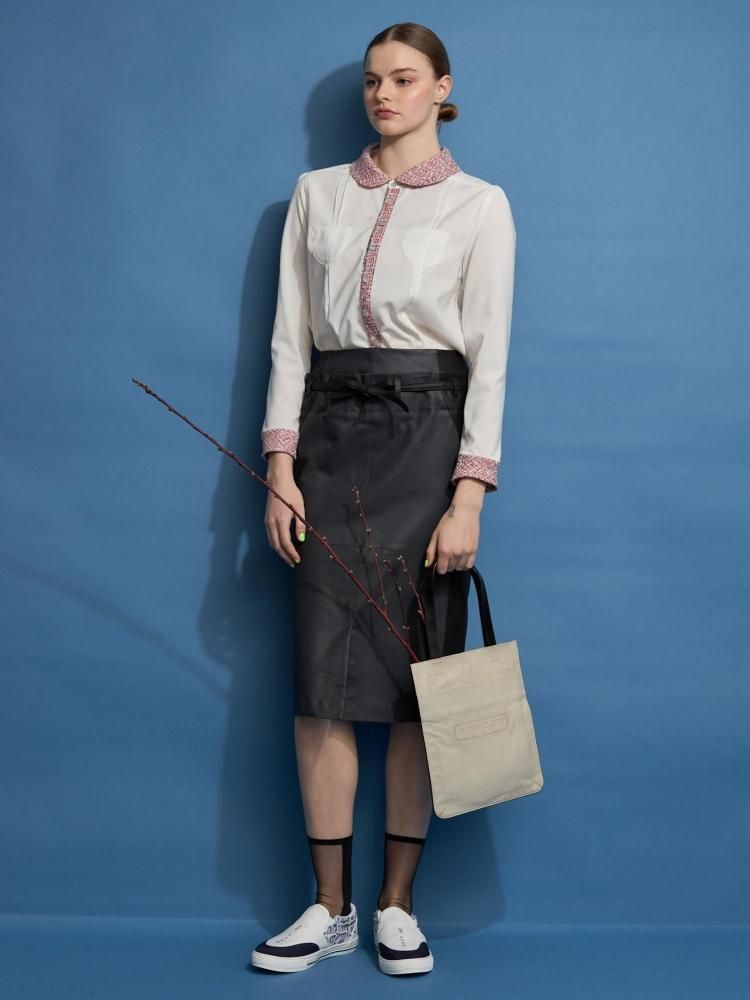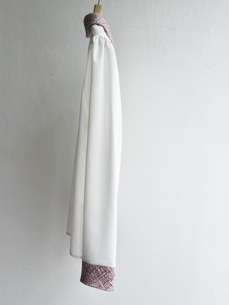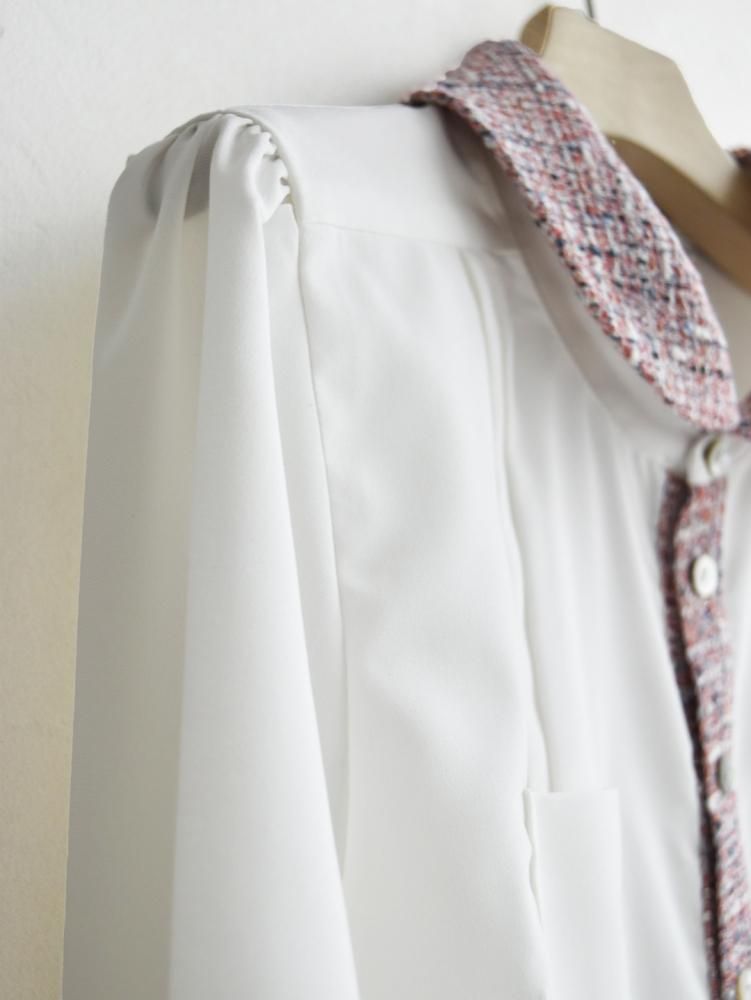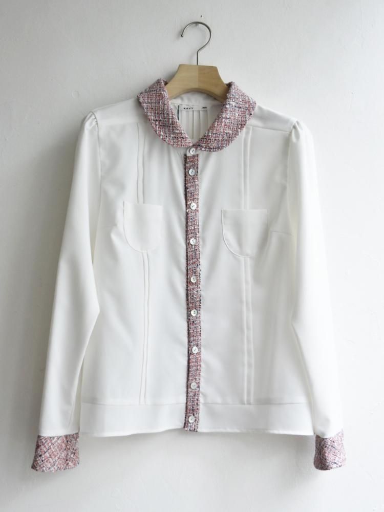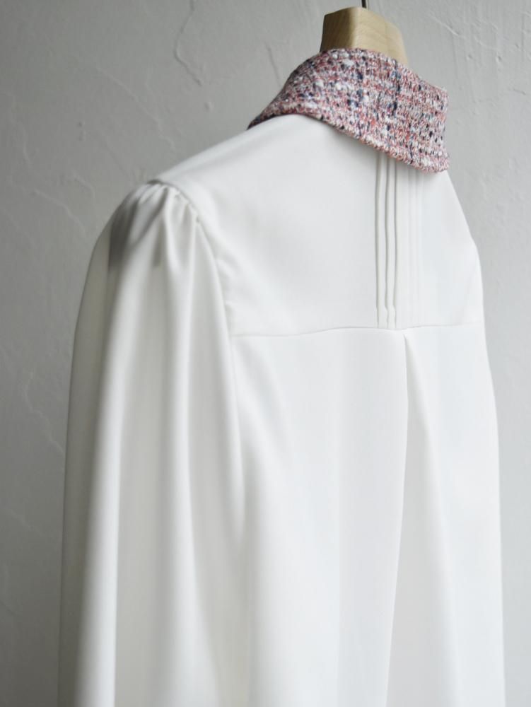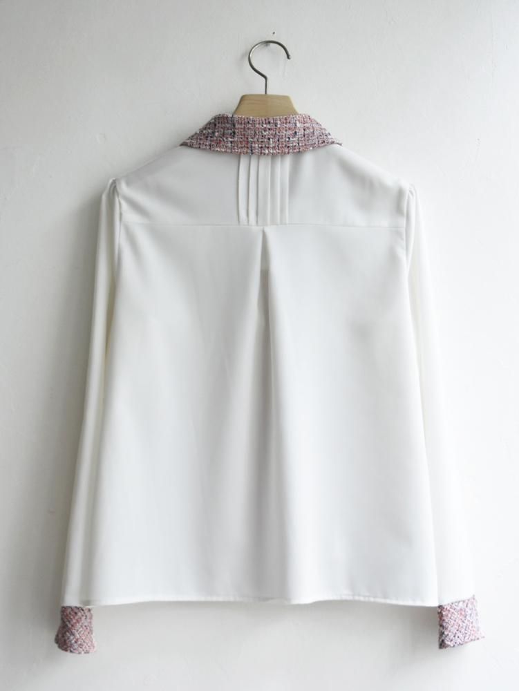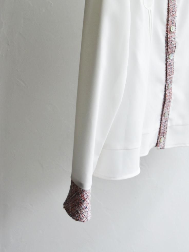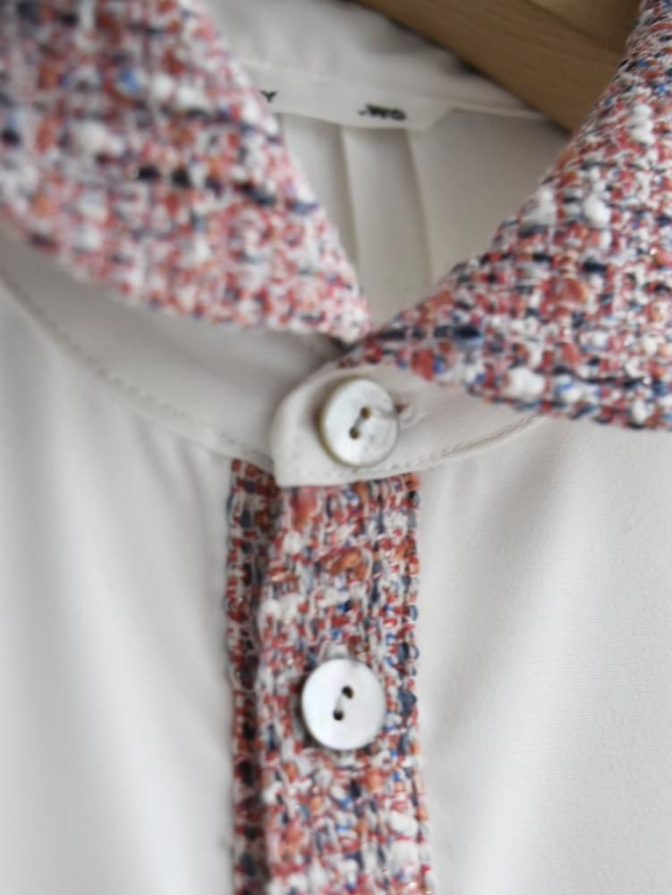 襟と袖に色彩と風合いの豊かなファブリックを使用したブラウス。