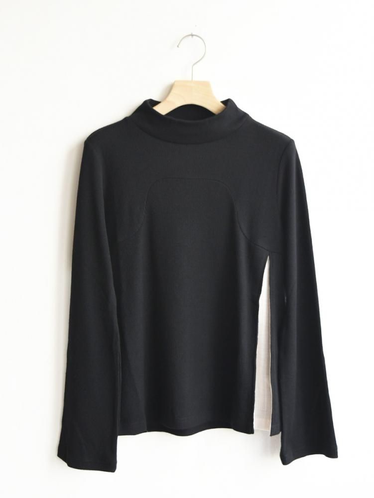低めに立ち上がったやわらかいハイネックは、着る人に柔らかな印象を与えます。