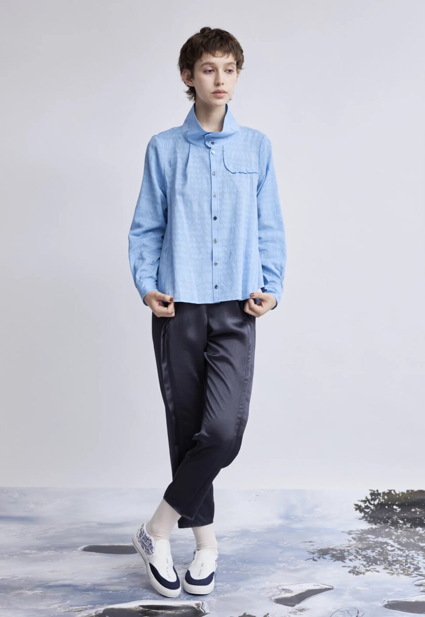 大きめの立ち襟はふんわりとニュアンスがあり、折り返して着るとまた違った雰囲気に。